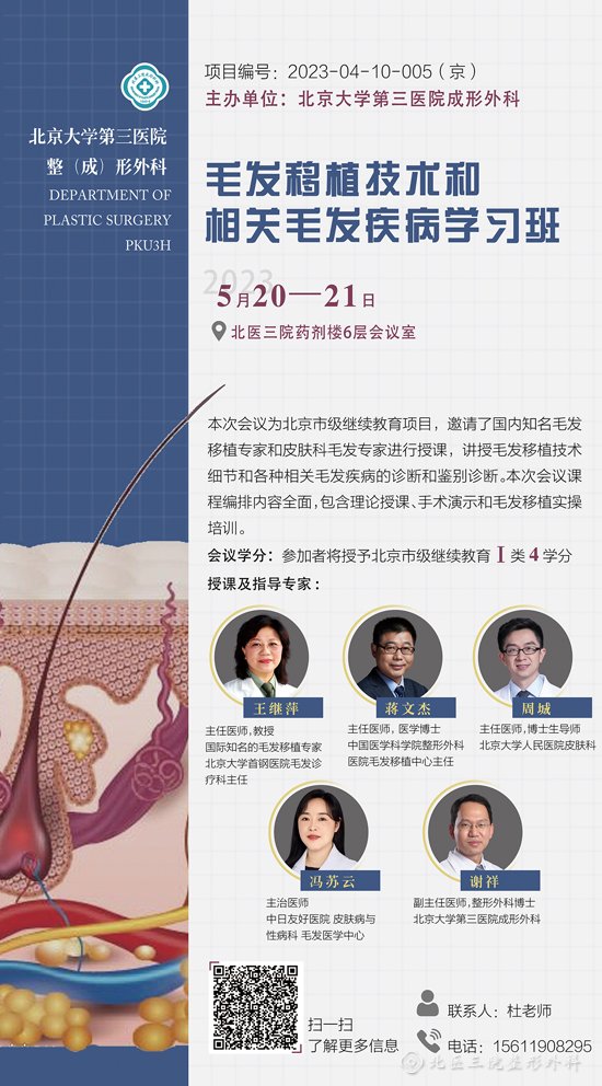我们将于2023年5月20-21日举办“毛发移植技术和相关毛发疾病”继续教育学习班。