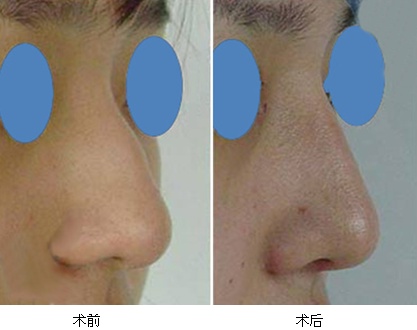 ④ 继发畸形:术中鼻骨与软骨去除过多所致;缩窄鼻背时,外侧截骨位置过高所致。