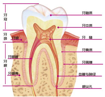 牙周组织由四种软硬组织构成:牙龈、牙骨质、牙槽骨和牙周膜。牙龈是口腔黏膜的一部分,是牙周组织的最外周部分。牙骨质是覆盖于牙根表面的硬组织,近牙颈部薄,根尖和根分叉处厚,色淡黄,硬度与骨相似。而牙槽骨不是一块单独的骨,而是上下颌骨包绕牙根周围的部分,也叫牙槽突。其与颌骨体相连续,两者之间并无明确的界限。