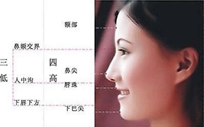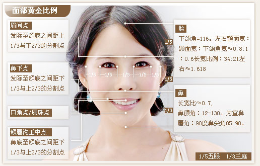 - 在面部正中作一条垂直轴线,通过眉弓作一条水平线、通过鼻翼下缘作一条平行线;这样,两条平行线就将面部分成三个等分:从发际线到眉间连线;眉间到鼻翼下缘;鼻翼下缘到下巴尖,上中下恰好各占三分之一,谓之“三庭”。而“五眼”是指眼角外侧到同侧发际边缘,刚好一个眼睛的长度,两个眼睛之间也是一个眼睛的长度,另一侧到发际边是一个眼睛长度。这就是“五眼”。