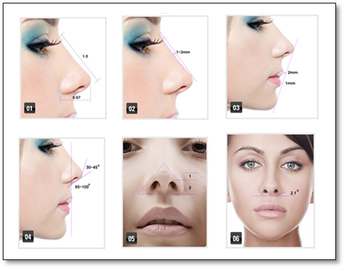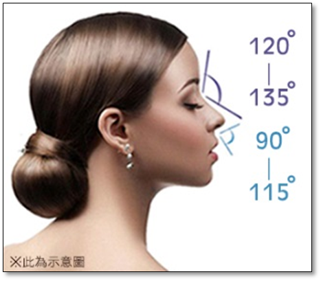 • 鼻唇角小於90度會顯得鼻子過長,稱為箭鼻;鼻唇角大於115度,