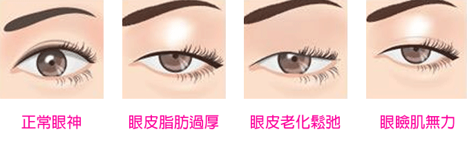 眼皮蓋住眼珠的部分過多,而眼珠露出的部分太少、容易給人無精打采且有大小眼情況。有神的眼睛,黑眼珠直視正前方時應僅被蓋住1~2mm,若大於2mm即為眼瞼下垂,必須對症下藥,調整不協調的那一側或雙眼的提眼肌,普通雙眼皮手術並無法改善。