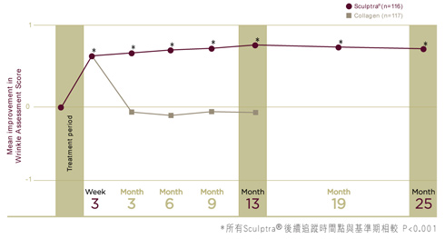 在美國進行的前瞻性、隨機、對照臨床試驗,舒顏萃 Sculptra®已被證明,在第13個月可有效矯正不同凹陷程度的鼻唇溝,注射後最長可持續有效校正不同凹陷程度的鼻唇溝達25個月。