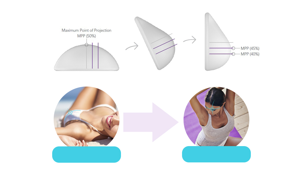 Motiva假体在站立时是水滴形状,躺下时呈现散开的圆形.律动时也能够呈现自然胸型的假体.