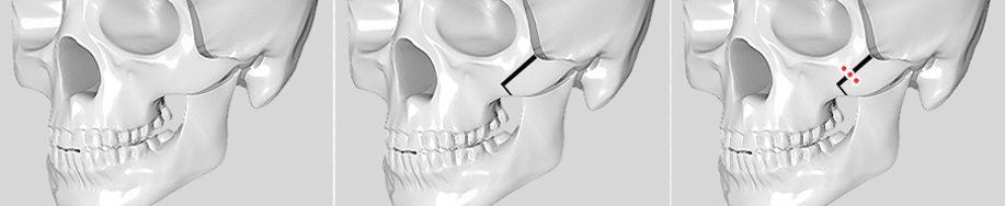前颧骨-45度颧骨-侧颧骨的“衔接性”维持:因前颧骨-45度颧骨-侧颧骨的衔接性维持,才可以维持前颧骨的立体感,削骨部位不会出现阶梯形的现象.