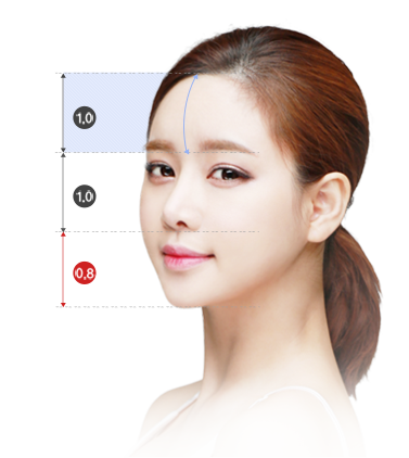 漂亮额头的理想比例是面部的上部(额头),中部,下部为1:1:0.8.