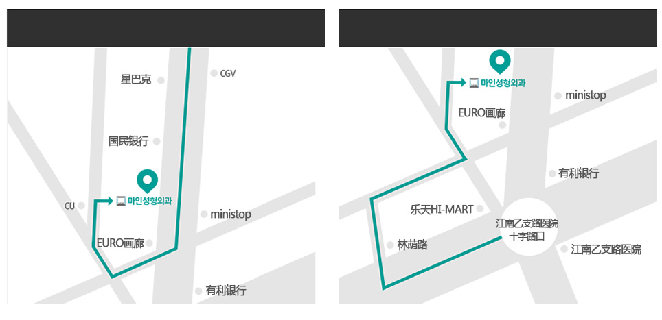 经过东浩大桥后在乙支路十字路口前右转,到达颜美整形外科停车场.