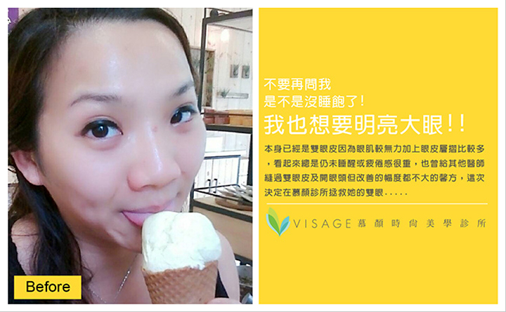 馨方一直希望能夠擁有明亮迷人的大眼睛,儘管她天生就有雙眼皮,但因為眼瞼肌無力、眼皮較多層摺的問題,眼睛感覺起來睜不開,整個人也顯得沒精神、氣色差,甚至還常常被朋友質疑是不是沒睡飽。