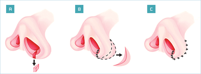 藉由切除部分鼻翼 或/與 鼻孔週邊組織、縫合技巧等方式來縮小鼻翼及改善鼻翼下垂與鼻孔外漏。