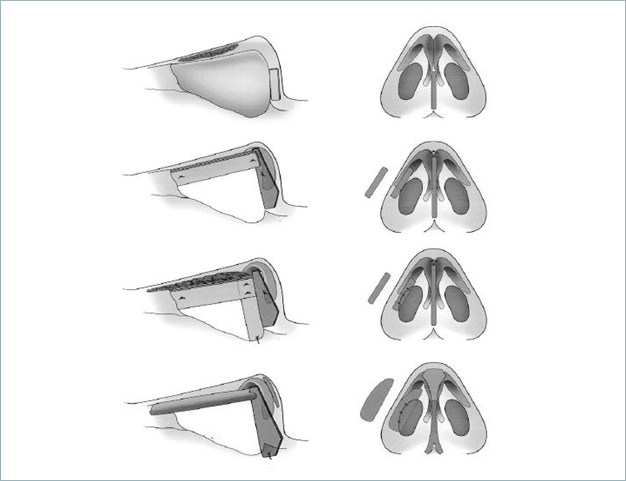 馬鞍鼻手術矯正根據鼻樑與鼻頭塌陷程度不同,可以選擇使用鼻中膈軟骨、耳軟骨、自體或異體肋軟骨來進行重建。手術方式是搭建與強化鼻樑骨架,並視情況置入鼻下外軟骨(lower lateral cartilage)植入物,撐起鼻樑與鼻頭,如下圖示: