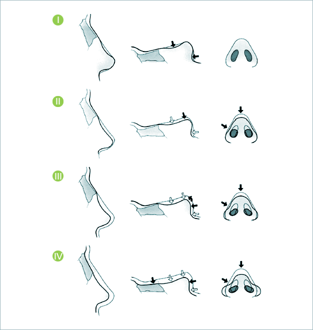 根據鼻樑塌陷嚴重程度不同,可以區分為四種型態: