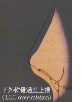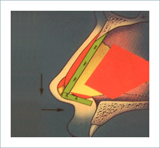 取用鼻中膈當軟骨支架,延長鼻中膈,將下外軟骨固定在期望的角度,可使鼻頭向下旋轉(de-rotation)。