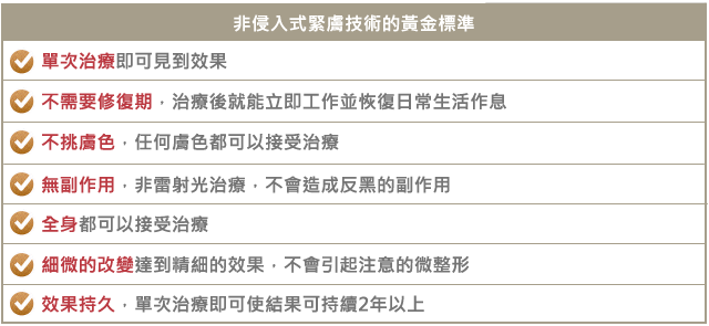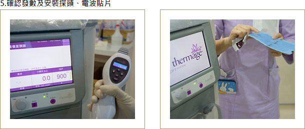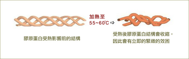 在臉部與身體不同部位,使用不同的專屬探頭,可以精確的在皮下 1.1mm-4.3mm組織局部加熱達到 60-700C。根據醫學研究,此溫度可以使皮下膠原蛋白重新排列增生,進而達到皮膚拉提緊緻的效果。此專利技術的特點在於皮下加熱而表皮溫度卻不增加,在正常的操作下,不會有皮膚燙傷的問題。Thermage 與雷射光療的原理完全不同,因此完全不受膚色的影響,治療後不會有結痂或術後反黑現象,非常適合亞洲人。也因為術後不會有任何表皮傷口或復原時間,所以更可以立即上妝。