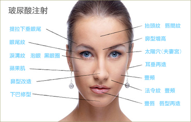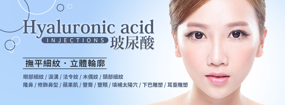 玻尿酸(Hyaluronic acid)是一種多醣體,天然地存在於各種生物體的組織內,由於玻尿酸吸水後會有自然的體積膨脹,具黏稠性、伸縮性,所以是非常理想的填充劑,將玻尿酸注射於治療部位,可撫平臉上皺紋,改善輪廓原本凹陷的部位,效果立即可見!