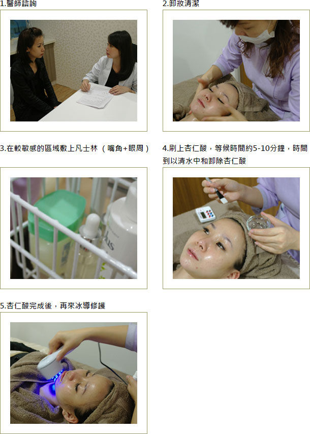 醫師諮詢 –卸妝清潔 - 拍照- 眼唇鼻翼保護 (凡士林) - 刷杏仁酸 - 靜待5-10分鐘 - 清水中和 - 玻尿酸導入 - 保濕修護面膜 - 完成