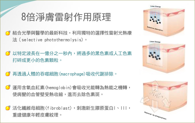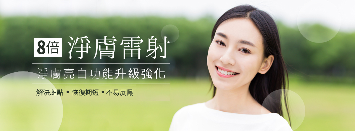 淨膚雷射是利用1064nm釹雅鉻雷射的波長,為表皮與真皮深部黑色素吸收,達到改善膚色不均的治療效果。本診所使用的Helios II 8倍淨膚雷射,相較於過去傳統的淨膚雷射,有更優越的新一代技術:採用1064nm/532nm的治療波長與低溫飛梭探頭,搭載飛梭功能Q開關,運用細胞膜波型光束輸出,讓釹雅鉻雷射光束能均勻地作用在皮膚上,更能有效縮短治療時間!而且8倍淨膚雷射的能量(J/cm2,單位密度能量)比傳統的淨膚雷射高,穿透深度也較深,能夠有效破壞位於真皮層的各種色素斑,而不會損害任何周邊正常的細胞,可減少術後皮膚反黑機率。除了解決斑點困擾外,8倍淨膚雷射還能清除粉刺、縮小毛孔,解決您肌膚顏色不均勻的困擾,達到淨亮肌膚的效果!