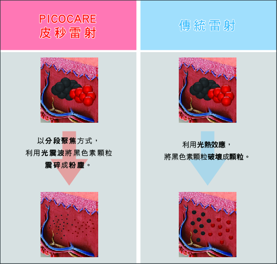雷射儀器不斷推陳出新,然而唯有透過不斷的驗證,才能調整出更合適的雷射。仿間許多舊型皮秒雷射,治療效果參差不齊,許多民眾反應術後容易產生反黑效果。而PICOCARE真。皮秒雷射採多種波長,搭配極短超脈衝,能夠針對表皮層及真皮層區域的色素團塊,瞬間粉碎,達到更精準治療效果,同時降低術後紅腫及反黑現象。