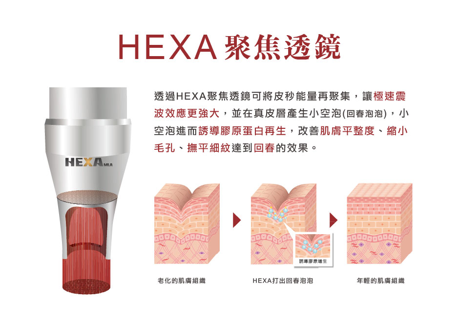 HEXA智能多焦透鏡能夠將雷射能量聚焦並分成細小點狀放大輸出能量,搭配1064或532波長,以精準不傷害周圍細胞的前提,將能量送達到欲治療的肌膚表皮層或者深層的真皮層,降低肌膚總傷害面積,刺激膠原蛋白重組與增生,達到肌膚重建效果。