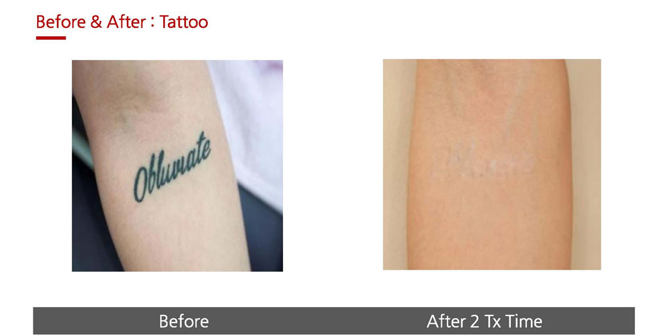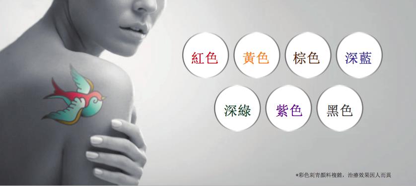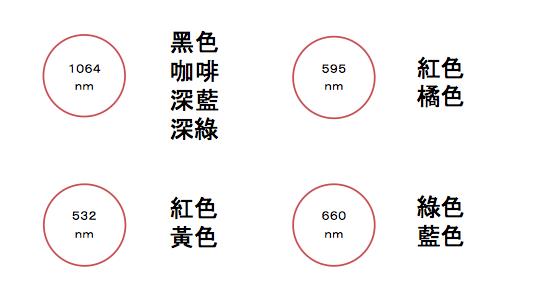 PICOCARE真。皮秒雷射擁有多波長1064nm&532nm(595nm、660nm),不僅在斑點上可針對深層淺層分別處理,在刺青的處理上,更是可以1064nm波長對應黑色、咖啡、深藍、深綠色刺青;以532nm波長對應紅色、黃色;以595nm波長對應紅色、橘色;並且以660nm波長對應綠色、藍色,共計至少7種顏色的刺青都可藉由PICOCARE真。皮秒雷射一機搞定。