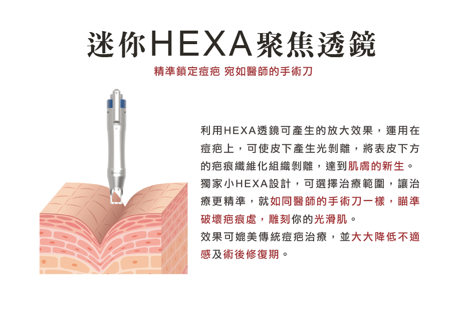 迷你HEXA智能多焦手握把又稱痘疤手術刀,小光點的設計,可針對適應的範圍做選擇。利用皮秒空泡效應原理,破壞皮下糾結的疤痕組織,誘導真皮新生,並保留表皮完整。效果精準相當於傳統治療,但卻大大降低了治療時的不適感和術後的修復期。