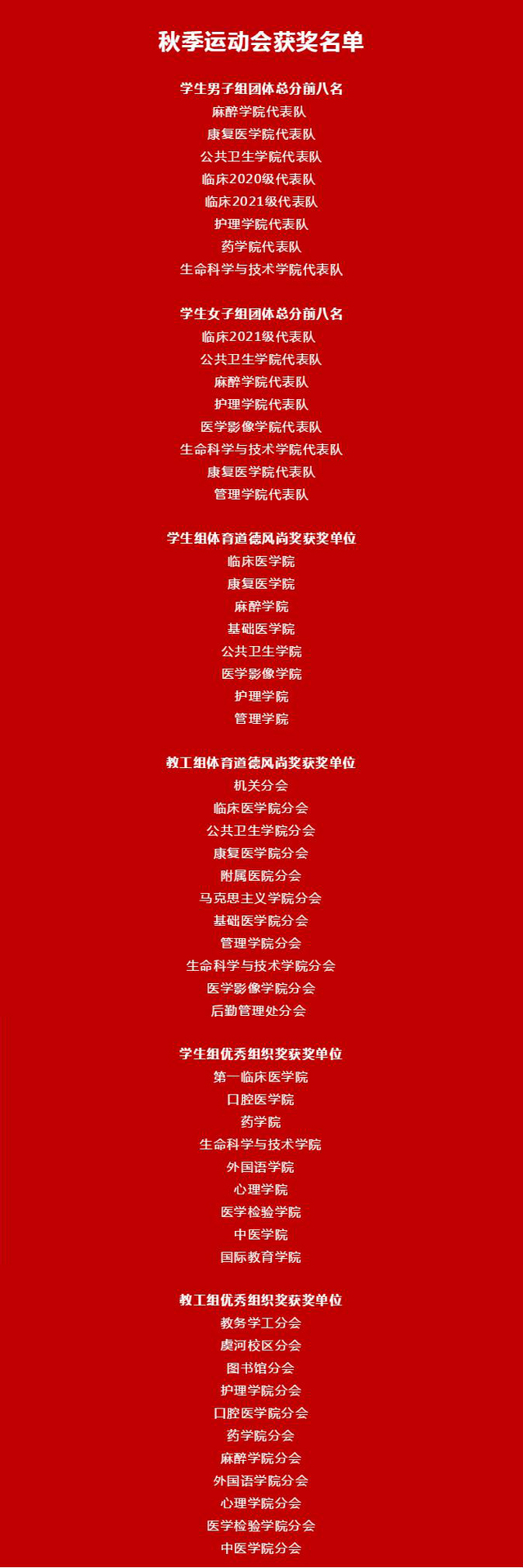 运动会期间,各代表队和全体运动员顽强拼搏、不畏艰难、敢于争先、超越自我,以实际行动诠释奥林匹克精神和中华体育精神,实现了运动成绩和精神文明双丰收;全体裁判员坚守岗位、履职尽责、公正裁决,全力创造优质竞赛环境;全体工作人员、志愿者和同学们精心组织、热情服务、文明观赛,积极营造团结鼓劲、安全有序的比赛氛围。全体师生医务员工用实际行动诠释了“自强不息 锐意进取”的潍医精神,展现出了凝心聚力、争创一流的良好面貌,为学校群众体育发展汇聚起强大动能。