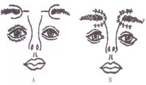 Y-V成形法矫正眉位不整是根据个人眉形及位置的不同,设计所需要矫正的范围,在眉间半区做Y形切口,皮下深层剥离后按V形缝合,达到矫正眉位不整的效果。