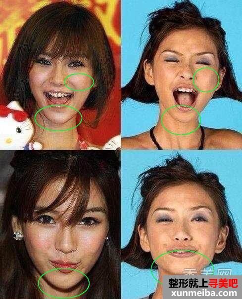 baby右图笑起来不见深深的法令纹,但是近照丰苹果肌之后,每次笑起来法令纹已经很明显了,近照中的baby下巴似乎有加长了。