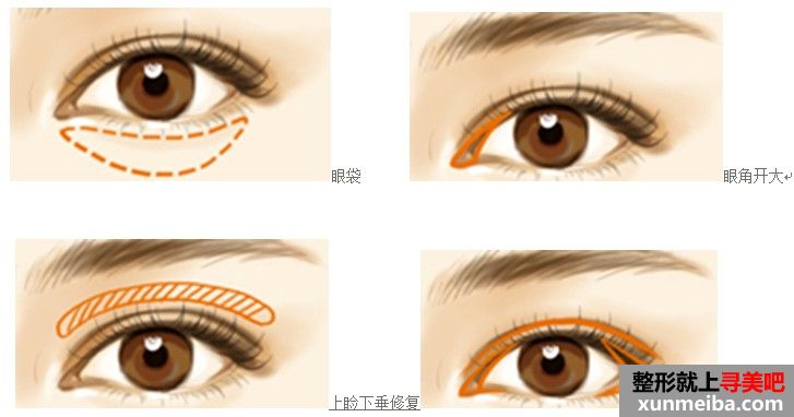 6、眼部整形美容性手术:重睑成型、内眦赘皮矫正、眼袋整复、眼皮肤松弛整复、美容性斜视矫正、眉下垂矫正、鱼尾纹去除、角膜染色、义眼配制、现代美容文刺等。