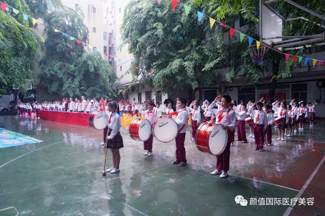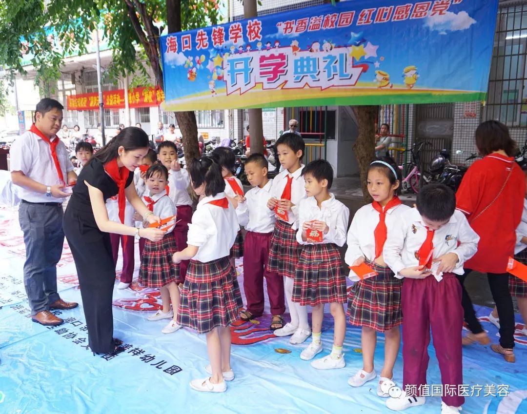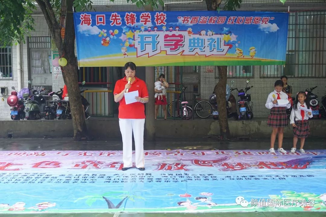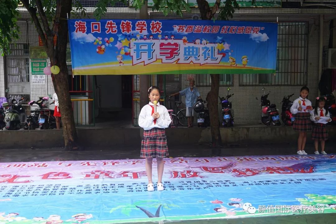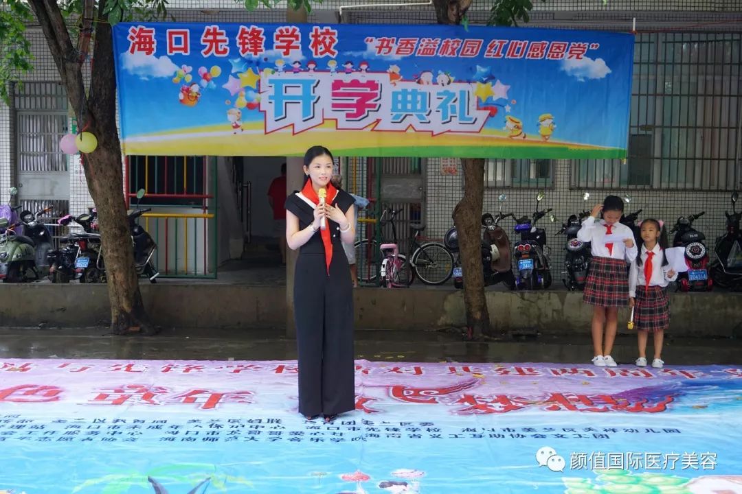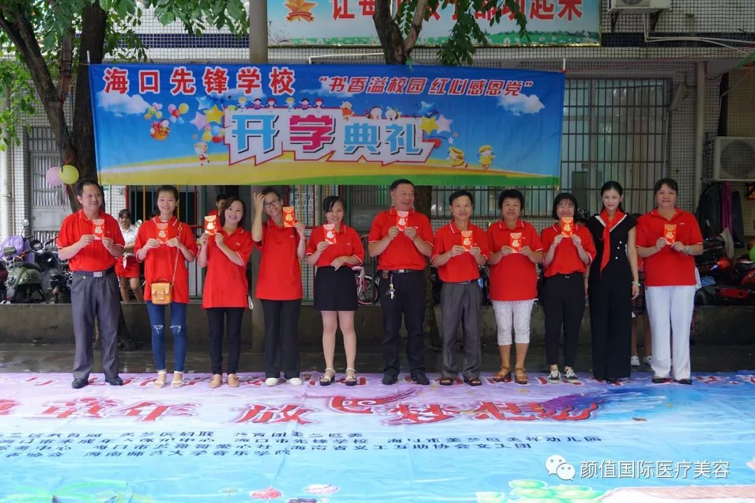 今天是本学年度的第一个星期一,学校例行举行升国旗仪式,孩子们陆续汇聚到了升旗台前。不过,今天除了孩子们之外,还有一群特别的客人,他们是由海南颜值医美副总经理何芬女士带领的“圆梦天使”爱心公益小分队,他们冒雨前来参加孩子们开学典礼,并为孩子们献上爱心和祝福。