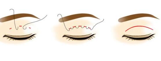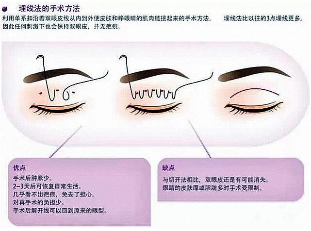 该方法操作简单,创伤小,不留疤痕,肿胀迅速,无需拆线,更适合眼睑薄、眼裂长、皮肤无松弛的年轻人;不适合眼皮厚、皮肤松弛、年龄较大的人群,有可能双眼皮会消失。