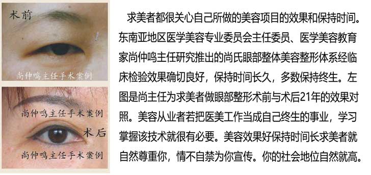 眼袋是衰老的征像之一,祛除眼袋恢复年轻状态是很多求美者的夙愿。眼部美容整形学术权威、美容医学学科奠基人之一、医学美容教育家、尚仲鸣主任在眼部整形美容方面研究颇深, 成就显著。他从人体解剖学、生理学、容貌美学入手,将心理学、面相学、哲学、力学、中国画人体审美、民间审美趋向等学科知识融入其中,搜集中外眼部整形美容资料、案例。反复研究、分析、推理、综合、分解、派其糟粕,去粗取精,去伪存真,另辟蹊径、推陈出新。在总结学习先贤的基础上,研究推出了尚氏眼部整体美容整形一整套完整的理论体系和实用操作技术,经临床验证,效果良好。四十年做了三万多例案例,对各种年龄、各种眼形、选用各自相应适合的手术方案,展现出前所未有、良好的美容效果,使眼部美容技术达到了出神入化的地步。尚氏法祛除眼袋睑下凹陷填平术是尚氏眼部整体美容整形其中的项目之一。