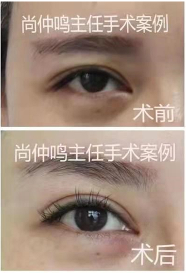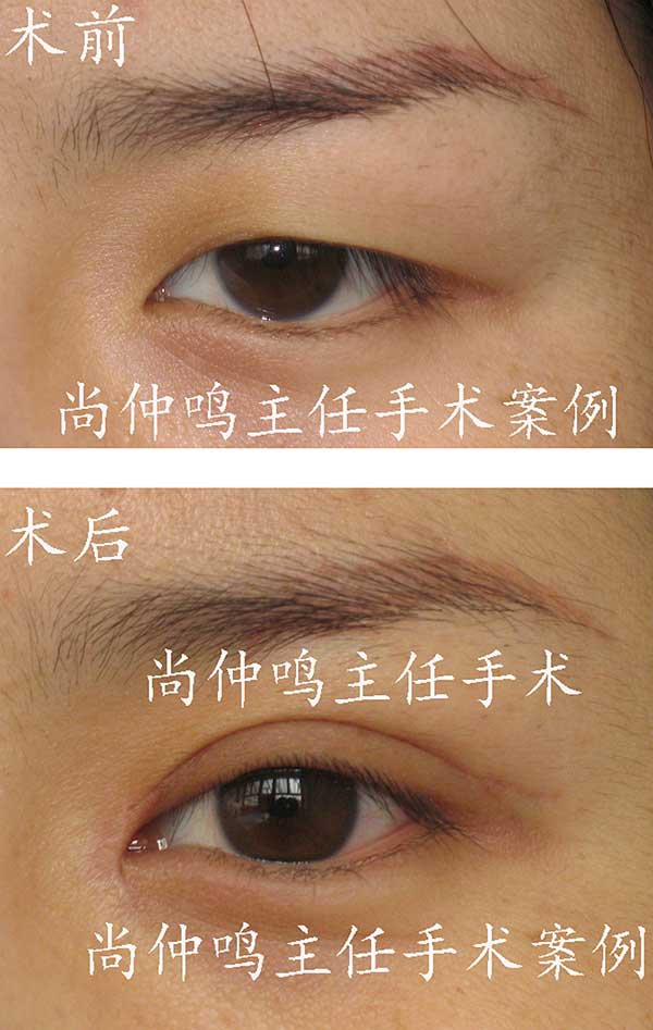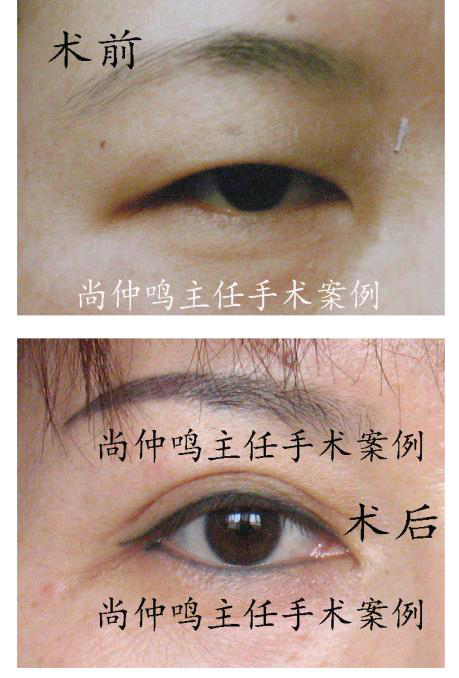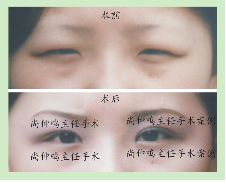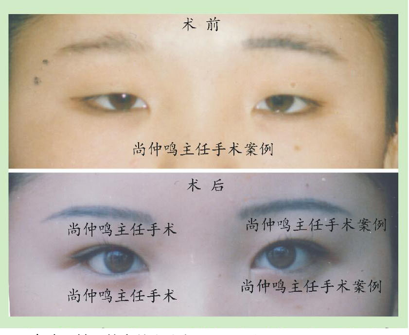 上图是尚仲鸣主任为上睑下垂者做矫正手术的对照资料。上睑下垂是先天性的,矫正手术相对难度大。提示:没参加过高等专业培训的工作者最好不要做。