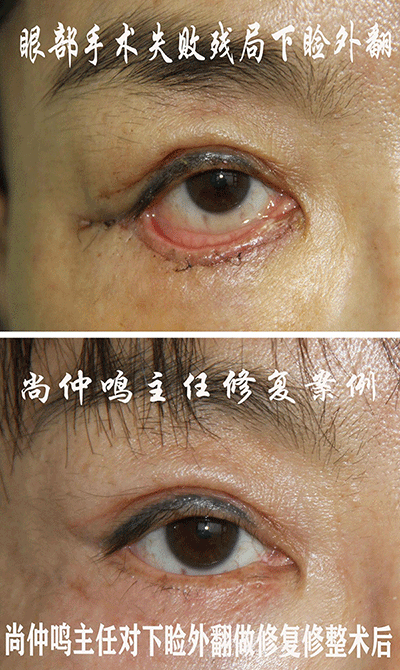 下睑外翻是做祛除眼袋手术者没有经过规范专业的培训,手术方案不科学、技术水平不到位所致的严重并发症,造成毁容。给求美者及家人带来极大的痛苦和精神上的压力。修复修整难度很大。上图是尚仲鸣主任为受害者做残局修复手术前后的对照。提示:求美者做整形须慎重,三思而行。操作者应参加国家正规的学习培训,学习掌握了规范高水平的技术,获得了合法的资质后方可上岗。