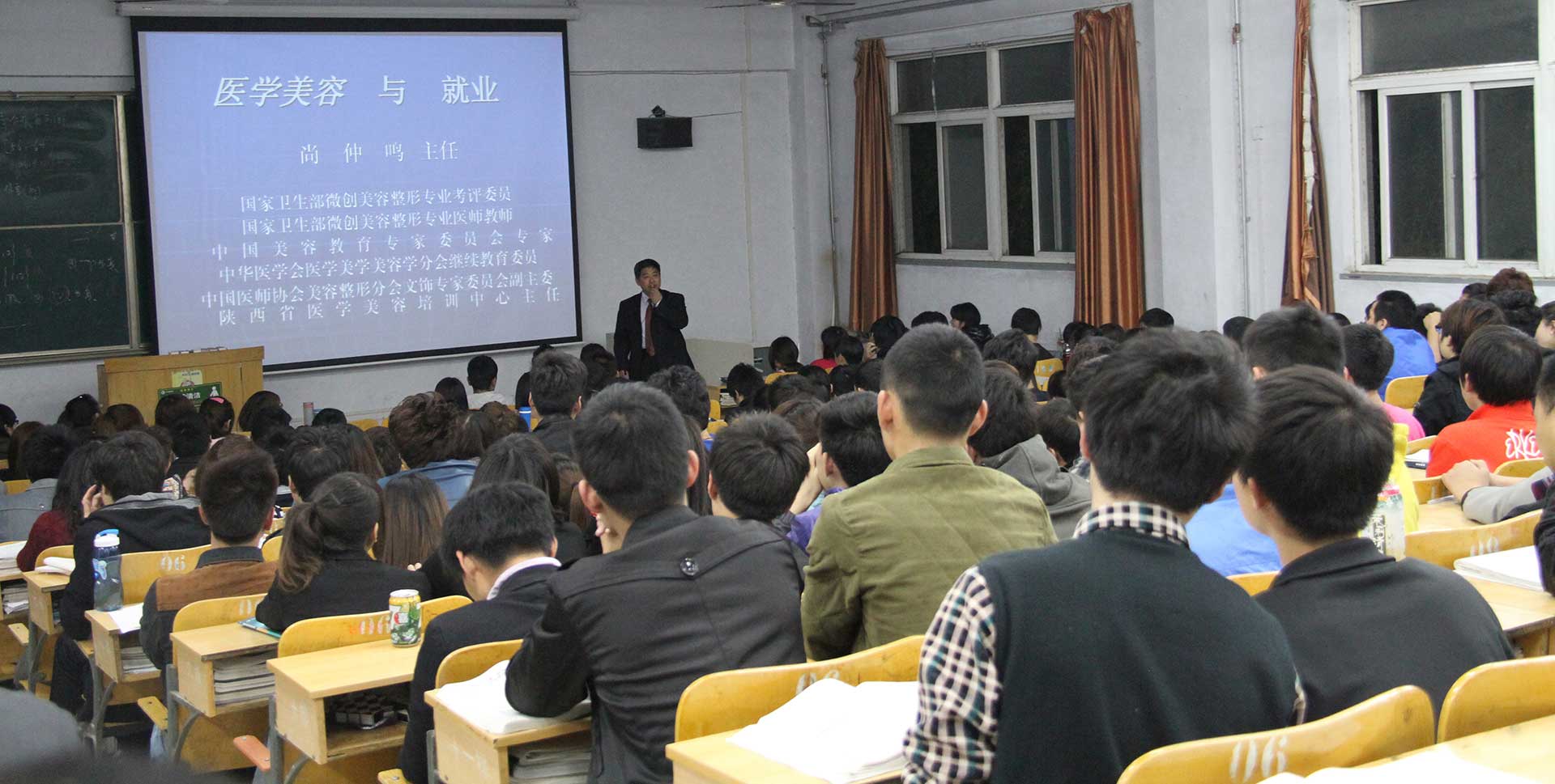 医学美容教育家、中华医学会陕西省医学美学与美容学分会医学美容培训中心尚仲鸣主任在给医学院临床医学系学员讲述医学美容的社会价值。