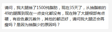 做完大腿吸脂后,很多人最关心的就是能瘦多少?一般大腿吸脂后,都要经历一个消肿恢复过程,并不是一开始就能享受到瘦腿效果。随着恢复吸脂的效果会慢慢呈现,腿围开始变化。但是也有些人如下面的求美者一样,吸脂一个多月,大腿并没有瘦的迹象,这到底是什么原因呢?
