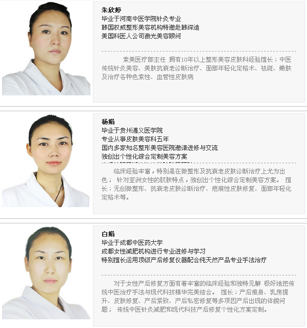 素美专家团队由集团从北京、上海分院派驻临床经验丰富、专业技术全面的顶级专家组成,专项研发出针对亚洲女性皮肤问题的美肤解决方案,从修复、治疗、调理及养护四个方面一站式解决各类皮肤问题,并斥巨资引进飞顿Laser360°、Candela美肤激光工作站、ALMA Accent射频溶脂除皱系统、EVO整体护理系统等国际顶级美肤仪器,结合中医御方内外调理,以整合方案的形式全面打造焕发自信、快乐的女性天然神采。
